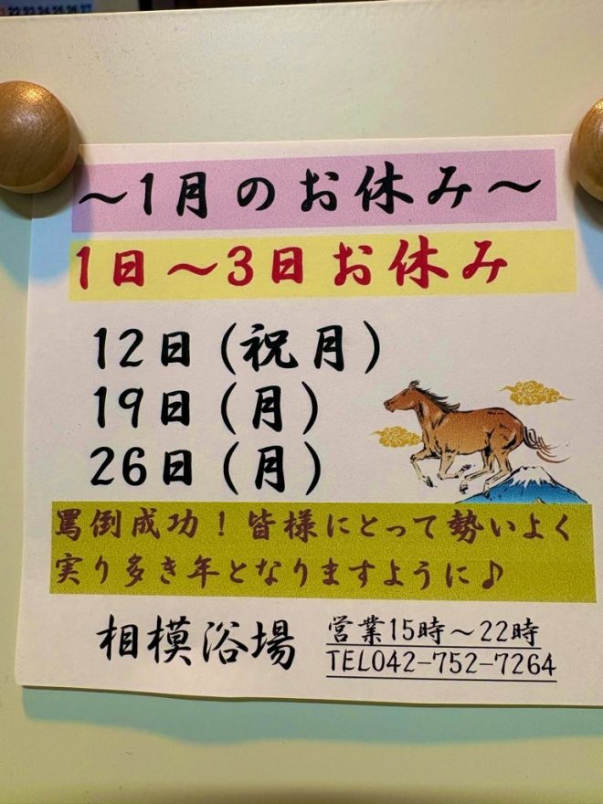 いつも相模浴場をご利用頂きましてありがとうございます♪ 12月は都合により3連休致します。 ご迷惑おかけしますがよろし…